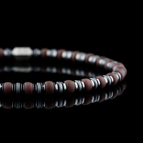 This bracelet has a striking, robust character. It features the deep, metallic gray of Hematite, which stands out against vivid, earthy brown accents. This bold contrast commands attention. Hematite is traditionally associated with strength and stability.