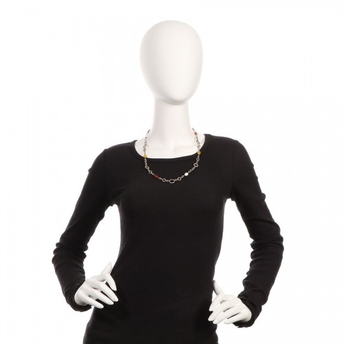 This John Hardy Chain Necklace is an amalgamation of color, texture, and shape that is uniquely Hardy! Six beads in red, yellow, and white are interspersed among the variously embellished and sized round sterling silver links. It secures with an ornate hallmarked lobster clasp with a tiny charm dangling nearby. In very good condition and gently worn, it comes with a pouch. Wear it day or night, with cords or cashmere—this neck candy knows how to pull off any look!