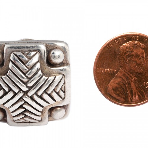 You could have posts added, but right now, Kieselstein-Cord’s Large Sterling Clip Earrings have clips on the backs. Needing a polish, they have a braided chevron look to the square fronts and a nice weight. They’re large earrings with a designer look to them!