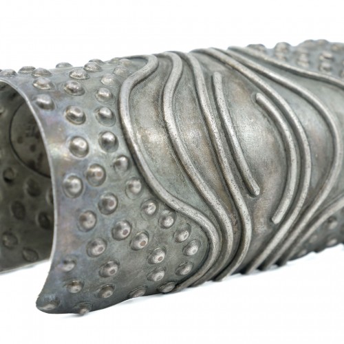 - Silvertone metal elongated cuff with raised organic lines and milgrain detailing