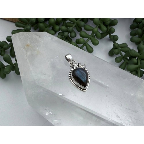 A stunning Labradorite Tear Drop gemstone pendant with a whimsical star and moon attached set at the top of the pendant around the bail. This pendant is made of sterling silver-925 and a semi-precious gemstone approximately 30mm x 50mm.