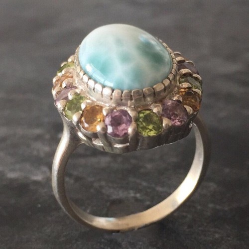Larimar Ring set with Natural Larimar in a cabochon cut with natural color & inclusions, at size 14x10mm together with Natural Emerald, Ruby, & Sapphire at size 3mm each (8 Cts combined).
