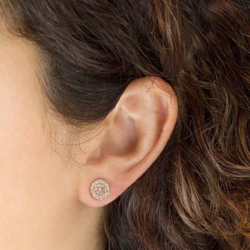 Rose gold pavé crystal disc studs add a touch of everyday glamour. Versatile and eye-catching, they style beautifully with loose hair or slicked-back looks.