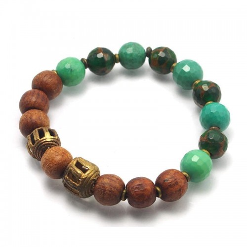 Mangowood, Chrysoprase and Mosaic Quartz Beads Elastic Bracelet with Brass Accents