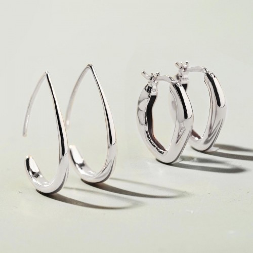 Silver waterdrop hoop earrings with a sleek minimal design that curves gracefully along the ear. Lightweight and effortless for everyday elegance.