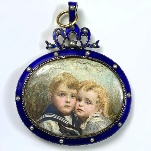 Stunning late 19th to earliest 20th century double portrait miniature, 2 beautiful little blond children – a boy and a girl. Blue eyed, surely brother and sister. The work of art is truly spectacular and yes it is a hand painted miniature. I am not seeing a signature, but I did not take it apart to check outer rim of the painting, nor backside. Those faces are less than 3/8″ chin to hairline. Imagine! The mount is truly befitting this painting, a silver locket pendant decorated in kiln-fired enamel set with seed pearls. The elongated stylized bow top and pendant bale are all in perfect condition. An 18k gold 8mm ring added, likely so it could be hung on a wall frame at bedside. Here is my fear – this pendant has mourning elements throughout. I hope it is not true, but mourning jewelry often has the evening or dusk blue sky of heaven, enamel. Mourning jewelry uses seed pearls, which represents the tears of the mourner. And mourning jewelry often included in that era, a curled lock of hair, often held in place with an 18k gold wire as you see on the backside of this double locket frame. Full measurements noted on the photos. Measured in mm, as it is the nature of jewelry. I found this one out of an unnamed collector’s estate in England. I believe the children and bespoke pendant are, as well.