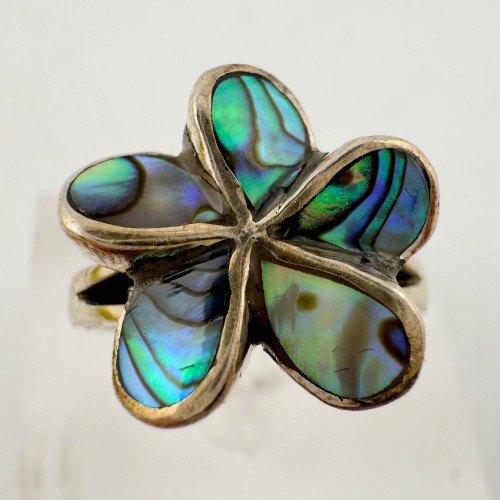 Beautiful natural abalone flower ring. Large colorful swirls in petals.