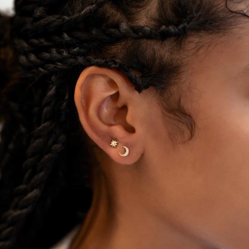 Gold crescent moon and star stud earring set adorned with cubic zirconia crystals. Lightweight and versatile, perfect for everyday or layered ear stacks.