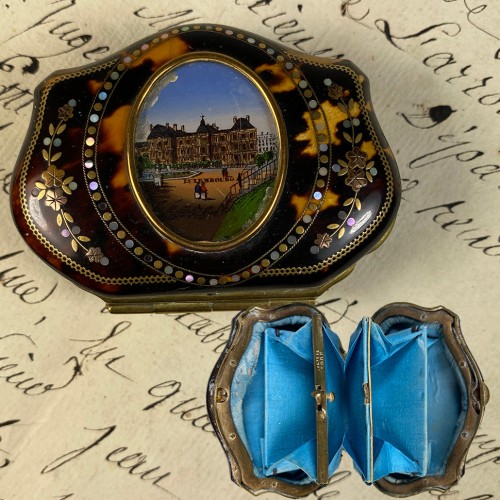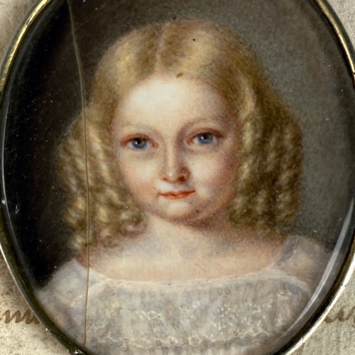 A beautiful little girl with huge blue eyes and long blond hair in ringlets, c.1830s. She’s a gem, tiny painting, and seems possible she was once part of jewelry (see mount and backside view). White gathers and lace in her off-shoulder dress along with her hair help in identifying the date of her portrait, but we have no artist signature and no ID. Sweetest little thing, she has a hairline to left of her face that does traverse the wafer. I have not tried to take her from the mount, fearing a separation. I’ve photographed her from a variety of angles so you can best evaluate it, as it is tight and disappears from some angles of view. Fortunately, not across her face at all. Measurements are noted on the photos, but her face is just 5/8″, chin to hairline.
