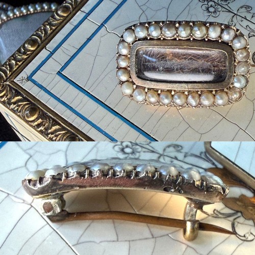 Petit Antique Victorian Seed Pearl Mourning or Memento Pin, Brooch in 10k Gold