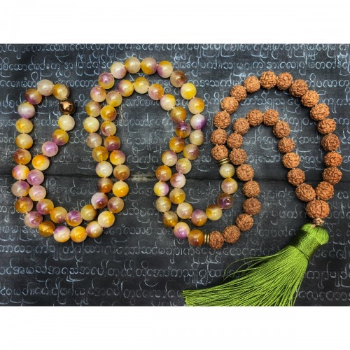 – Hand knotted Pink Chalcedony and African Opal knotted to form this beautiful mala, finished off with a Rudrashka guru bead, and a handmade silk tassel