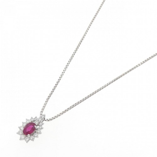 Indulge in timeless elegance with this platinum necklace. A stunning ruby, embraced by sparkling diamonds, adds a touch of sophisticated color. Lightweight and comfortable, it’s perfect for adding a luxurious accent to your everyday style, effortlessly elevating any outfit with its subtle sparkle and refined design.