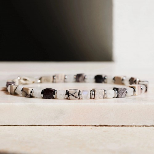 This bracelet has a modern, minimalist appearance. It features a harmonious blend of soft whites and gentle grays with subtle, natural speckling. The smooth, matte look feels calm and balanced. Porcelain Jasper and White Moonstone are traditionally associated with balance and intuition.