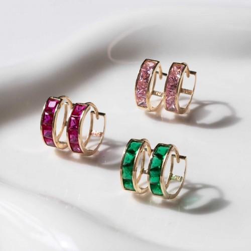 14K gold huggie earrings featuring princess-cut ruby stones in a sleek channel setting. A vibrant pop of color, perfect for everyday stacking.