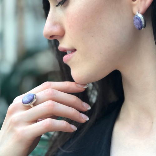 Purple Statement Ring set with a Natural Charoite in a top grade & rich purple color with natural patterns, at 18x13mm (15 Cts) from the Baltic Sea.