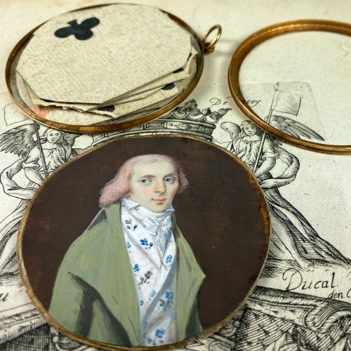 V RARE portrait miniature, “Incroyables et Merveilleuses” – (incredibles and marvelous) the slightly smug face of a spoiled rich fashionable Parisian making political statement. An exquisite but unsigned French portrait miniature, outlandish pink hair or topper wig, dog-ears fashion which along with the massive cravat and jaunty printed vest, and pale green broad-lapel waistcoat sets him squarely into the “Incroyables”, c.1795-1799. this blue-eyed young man who wears an elaborate white cravat with gold pin, and the ribbon of the Revolution (thick-wrapped cravat – reminder of the neck wounds of the guillotined Royals). He might well have been one of the wealthy students at the 1832 student uprising, Paris, barricade of a real-life Les Miserables, but in fact he dates earlier. The portrait is, I am certain, c.1795-99, instead, mean he is an aristocrat in support of Royalty overthrown and beheaded in The Terror. “Mods” in their time. A fashion celebrating excess, riches, these young people scandalized Paris in the days after the execution of Robespierre. The history is wonderful and must be read. The fat cravat is a typical sign of support and memorial to those aristocrats who were overthrown in the French Revolution, late 1700s. So he’s somewhere between 1795 to 1799 when the fashion exuberance faded. Opening his 18k locket-style frame, I find it stuffed with 8 hand colored c.1700s playing cards, cut to fit. Surely they had some significance to this Incroyable. A suggestion on back that he is “probably” Pierre-Antoine HERWYN. If so, you will find him in Wikipedia and other references. Do read – All the history is so interesting. After reading, however, I do not think this is the correct identity.