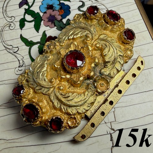 Rare in numerous ways, not only the fact that the choice was for profiles (an early preference/method) but also that it represents a father and son. Rare 18k gold drop-chain locket frame. Rare grisaille painting of the son, housed in a back-painted (eglomise) cover glass. Rare image of the son who is in the era and fashion of one of France’s most interesting fashion movements: Les Incroyables et Marveilleuses (Incredibles and marvelous), c.1795-99. That overly thick cravat and the overstated high collar, the dog-ear hair style and the slightly smug look – all are signature of the youth’s movement thus named. Young Royalists using fashion to protest the French Revolution, the fat cravat like a bandage holding a severed head on (guillotined). All taken together, this is one of my personal favorites. The old locket frame is perfectly intact, even with that little bending to the bale. I did not open it, though it does open and the clasp is along the bottom of the elegantly crafted 18k gold frame. I just didn’t want to take the chance of anything dislodging. The cover glass on these is thin, fine, fragile. I’ve tried to show the paintings well even through it. The painted gold Matt on the glass cover of the younger of the two portraits is bright gold in light. My images show it darker in some places. Measurements noted on the photos.