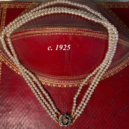 Found in France – A truly exquisite 3-strand pearl necklace, dating Victorian to Edwardian era, the 18k gold clasp set with center 6mm mine cut diamond in a champagne color (not graded, sorry) surrounded by halo of 12 2mm diamonds, for a clasp of 1/2″ diameter. The pearls are also exquisitely, perfectly matched and with excellent nacre and shine. The pearls are 4mm, perfectly matched. The wearable length (clasped) is 17 1/2″. Would be stunning for a bride’s “something old” to wear on a wedding day and keep forever after. The red box is a prop and is not included.