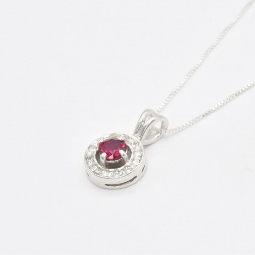 Red Ruby Pendant set with a Created Ruby in a flawless clarity, diamond cut & red color, at 5mm diameter, 0.6 Cts.