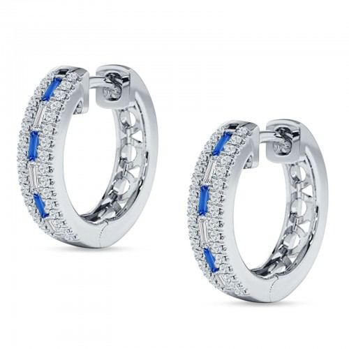 Round & Baguette Blue Sapphire CZ Huggie Hoop Earring 925 Sterling Silver Wholesale 14mm