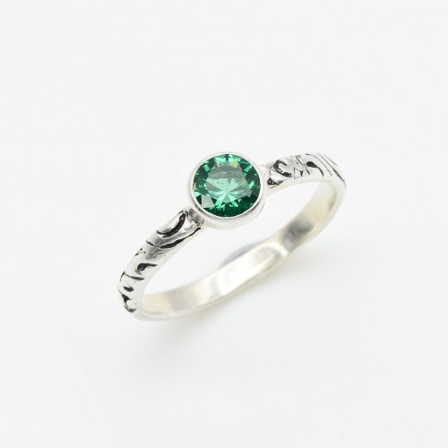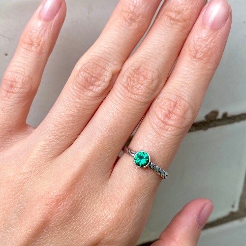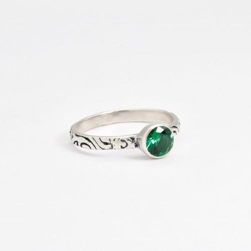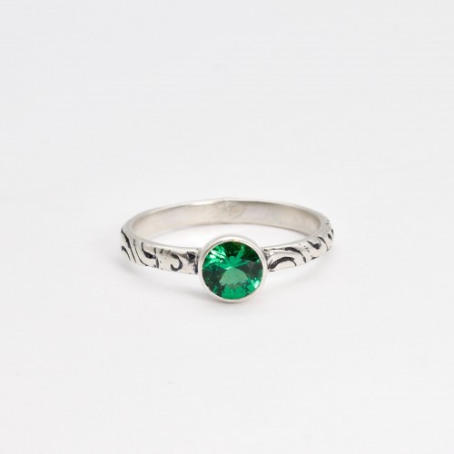 Round Emerald Ring set with a Created Emerald in a perfect diamond cut, flawless clarity & deep green color, at 5mm diameter (0.6 Ct).