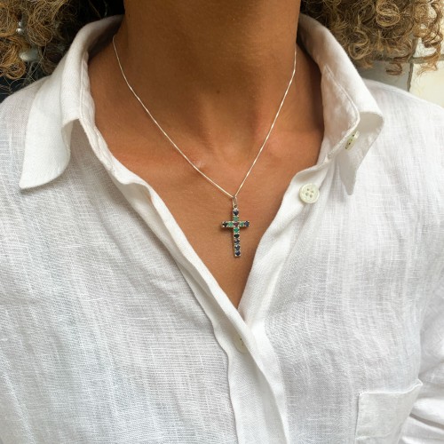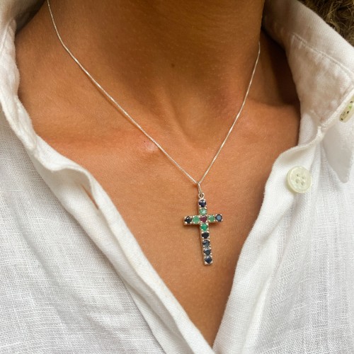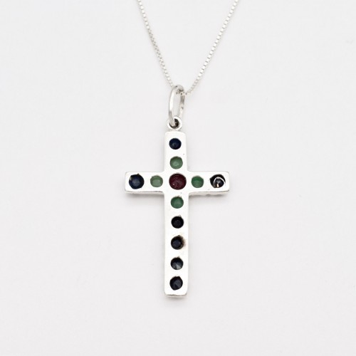 Sapphire Cross Pendant set with Natural Sapphire, Ruby, & Emerald in flawless clarity, diamond cut, at 3mm each, 1.3 Carats combined.
