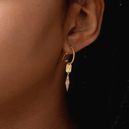 A striking hand engraved abstract eye watches above a geometric obelisk with delicate milgrain details, all suspended from a beautifully reflective hoop of delicate notches. These unique earrings tap into the‚wisdom of your intuition, and the all knowing Anja eye.