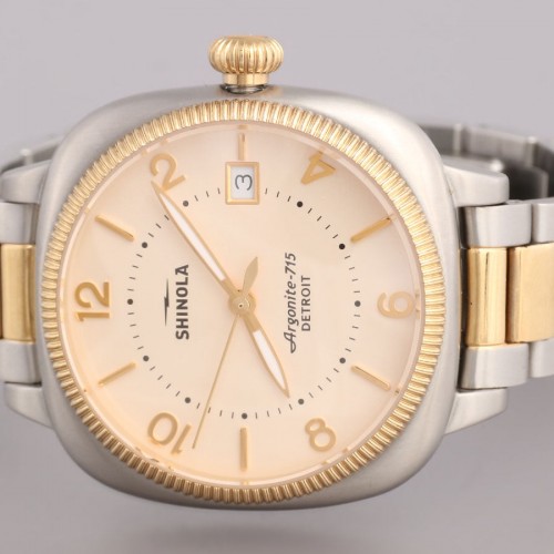 When you can’t make up your mind which side of your metal personality you want to keep time for you, go two-tone with Shinola’s Gomelsky Watch! It has a 36-millimeter head made of a combination of brushed stainless steel and gold-tone with a coin-edge bezel and cushion case. Arabic numerals alternate with index hour markers which are in gold tone along with the hour, minute, and seconds hands. It has Argonite 715 quartz movement, a date window at the 3 o’clock position, and a two-tone bracelet with a deployment clasp. In very good condition, it has marks on the bracelet. You know this watch has street smarts—it’s made in Detroit!