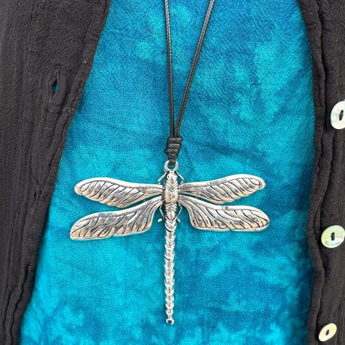 Silver dragonfly necklace on a black leather cord.