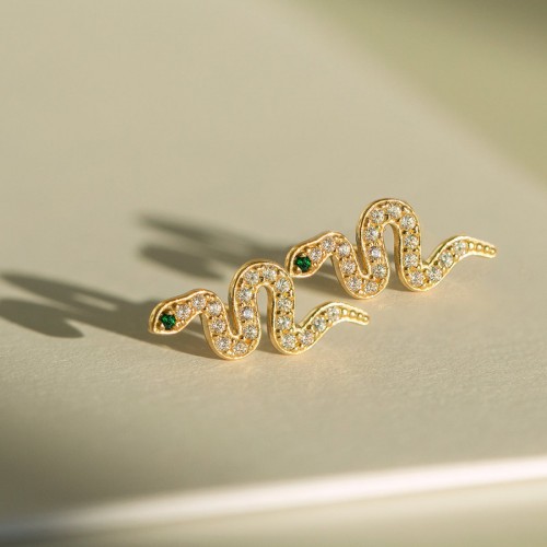 Representing rebirth and transformation, these serpent snake studs are encrusted with quality cz crystals and feature emerald gemstones