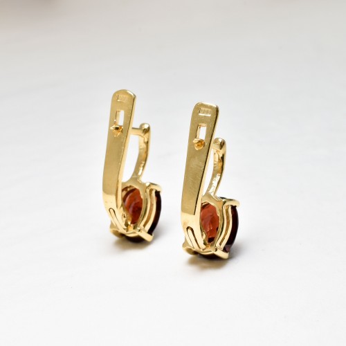 Solitaire Garnet Gold Earrings set with a Natural Garnet in a perfect diamond cut & a deep red color, at size 8x6mm each (4 Cts a pair) from Mozambique.