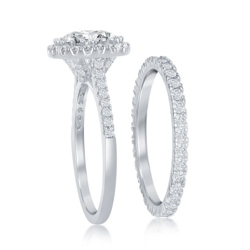 Sterling Silver French Set Round Halo Eternity Band and CZ Engagement Ring Set