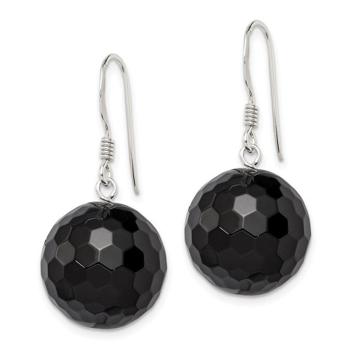 Sterling Silver Polished Faceted Onyx Bead Dangle Earrings 17mm