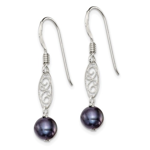 Sterling Silver Polished Filigree 5- Black Freshwater Cultured Pearl Dangle Earrings 6mm