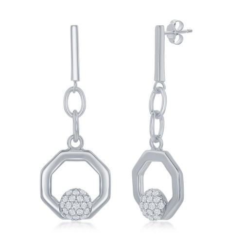Sterling Silver Round Micro Pave CZ Open Hexagon Pendant & Earrings Set W/Chain