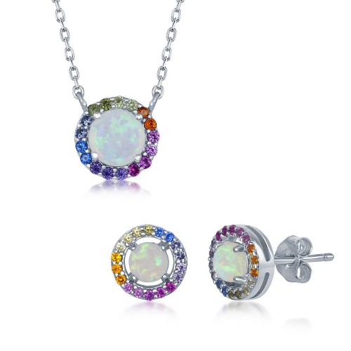 Sterling Silver White Opal Heart Rainbow CZ Necklace and Earrings Set