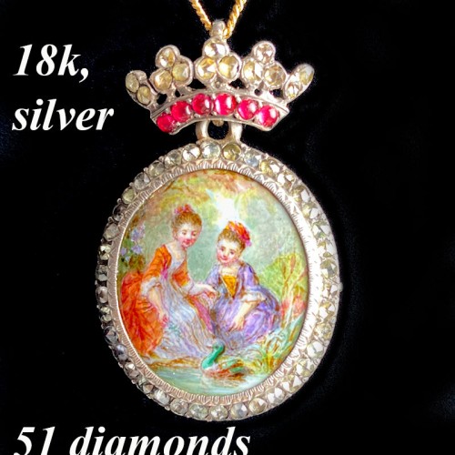 Very good to excellent condition for age and type, still bright gold finish (18k on fine French silver) and most of the pearls remain, though as you can tell, there would have been thousands strung and wrapped across that top round of the tiara. The impact is there, if not every single original pearl. These are likely seed pearls, though some of these in that era were made with French ‘created’ pearls. Such a rare fine piece!