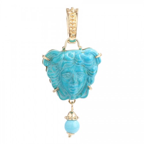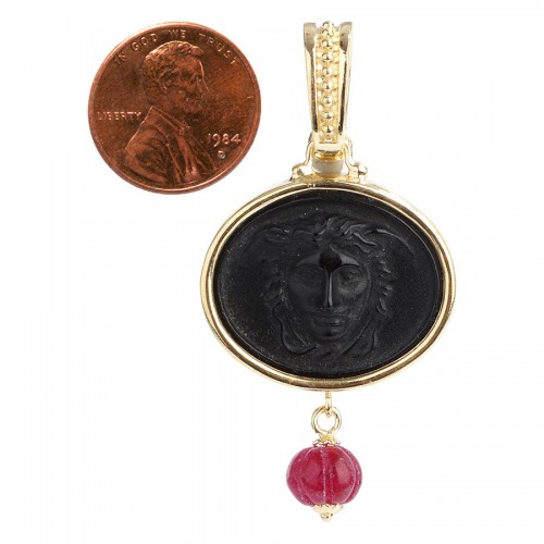 Tagliamonte gives you the flexibility of wearing this 18K Gold-Plated Ruby Drop Cameo Pendant the way you see fit—on a chain, cord, ribbon, or between the pearls of a strand or two! Made of 18K yellow gold-plated sterling silver, the round black cameo has a ruby bead drop suspended from a hinged bail that fits 8 millimeters by 6 millimeters. New and never worn, it comes with a box, pouch, and cloth. I love enhancers such as this—you can create a myriad of looks by simply changing what it’s attached to!