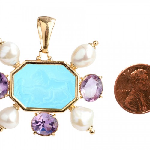 Handmade in Italy, Tagliamonte’s 18K Yellow Gold-Plated Multistone Venetian Glass Cameo Pendant will be the star of your chain or cord of choice! The blue glass cameo depicting a lion and man is heptagonal in shape (seven sides) and bezel set in 18K yellow gold-plated sterling silver. It is embellished with four pearls and three faceted amethysts and dangles from a bail that fits an 8-millimeter by 6-millimeter chain, cord, or ribbon. In very good condition, it comes with a box, pouch, and cloth and has marks on the metal. The 1.25-inch pendant is just the right size—large enough to get noticed but not so big as to be overwhelming!