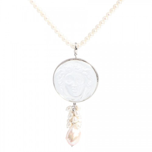This Tagliamonte 18K Gold-Washed Sterling Silver Venetian Cameo Necklace is made with real Roman coins! Four Venetian glass cameos alternate with three original Roman coins on an adjustable chain link necklace with a lobster clasp closure and a logo charm hanging nearby. New and never worn, it comes with a box. The necklace is 0.9 inches at its widest point and can be offset beautifully on bare skin or a solid-colored top!