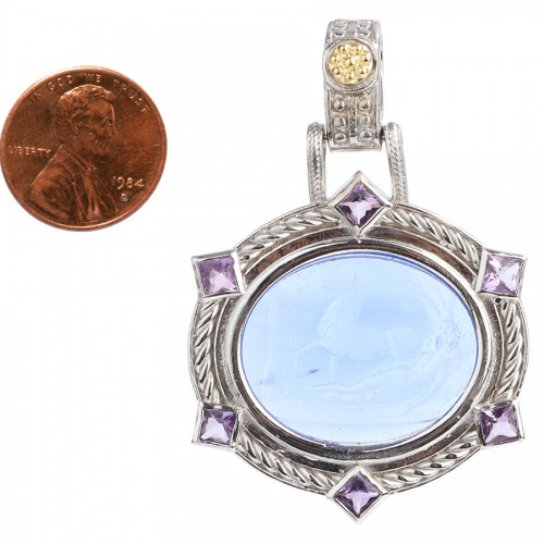 Tagliamonte’s Sterling Silver Amethyst Venetian Glass Pendant is a detailed jewel handmade in Italy! A round, blue Venetian glass depicting a horse and lady is set in cabled sterling silver with six faceted amethyst stones. It is suspended from a bail with 18K yellow gold details that accepts a chain or cord measuring 6 millimeters by 7 millimeters. New and never worn, it comes with a box, pouch, and cloth. The hinged bail makes it easy to attach the pendant to whatever you think it looks best on—a chain, cord, ribbon, or whatever your fertile imagination comes up with!