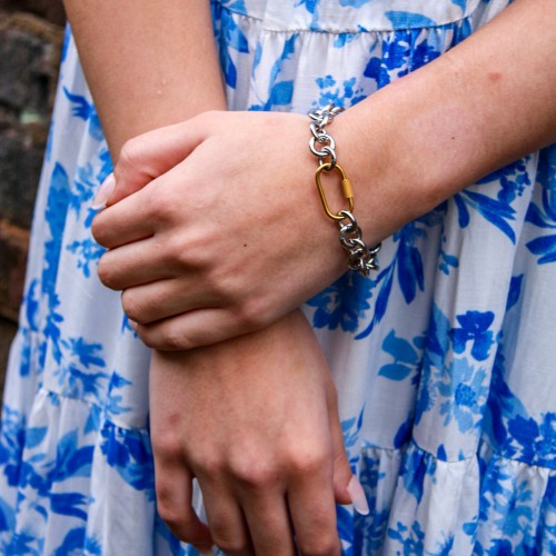 A very best-seller, this handcrafted bracelet is THE wrist standout to make ALL of your stacks work together with its trendy, gorgeous mixed metals! Handcrafted from quality steel elements.