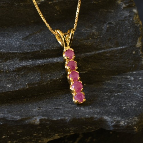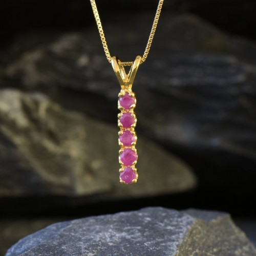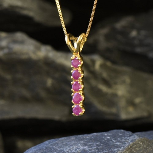 Vertical Ruby Pendant set with a Natural Ruby in a diamond cut & natural red color, at 3mm each (1 Cts combined), from Burma.